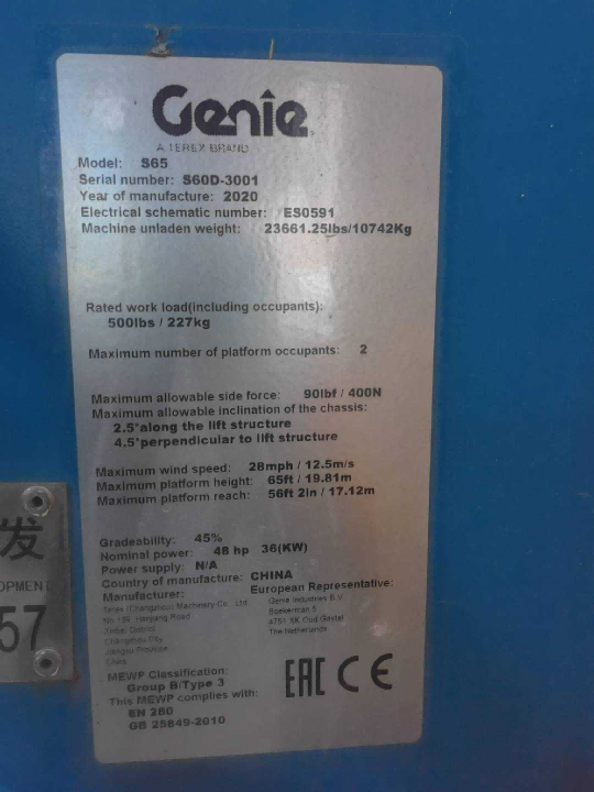 二手吉尼20米柴油轮式直臂车S65